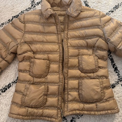 Moncler børnejakke i blå farve, størrelse 140 cm, designet til piger. Jakken er lavet med dunfyld for isolering og varme. Den har en quiltet konstruktion og lukkes med lynlås. Jakken er egnet til koldt vejr og udendørs brug.