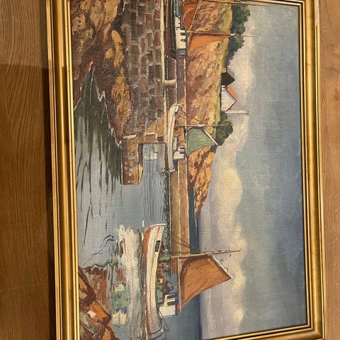 Maleri. Lille repareret skade i bagerste sejl. 96 X69 cm excl ramme