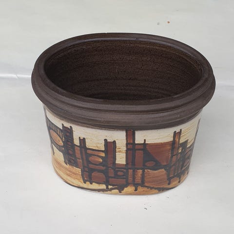 Birthe Simonsen Keramik Vase i lyserød farve med oval form. Vasen har en dekorativ kant med hvid zigzag mønster. Den er lavet af keramik og har Birthe simonsen’s signatur på siden. Vasen måler følgende H 15,5 cm L22,5 cm b 14,5