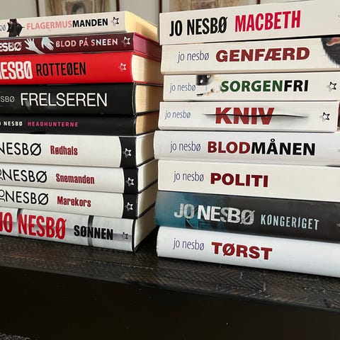 Jo Nesbø Romaner bestående af Blod på Sneen, Midnatssol, Macbeth og Kongeriget. Bøgerne er på dansk og indeholder forskellige krimi- og thrillerhistorier. Hver bog har standard bogstørrelse og er velegnet til læsning inden for fiktion og spændingsgenren.