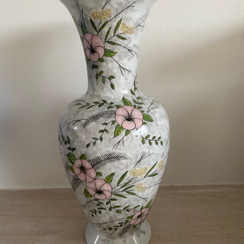 Håndmalet med lilla violer og en gylden kant og nogen steder er væk pga brug.