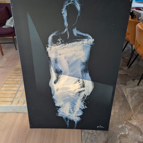 Maleri forestillende en kvinde med kaffekop, udført i varme og farverige nuancer. Billedet har et moderne og abstrakt udtryk med fokus på profil og detaljer i hår og smykker.