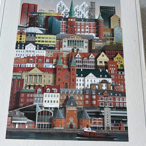 Aalborg med lysenes genskær i fjorden. 1000 brikker inkl. poster. Nogle af brikkerne har bitte små skader og som det fremgår af billederne har æske masser af små “ridser i lakken”. Fra hjem uden dyr og røg. Sender gerne. Ta’ et kig på mine andre puslespil.