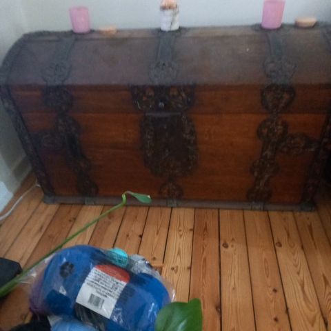 Antik Jernbeslået fladlåget Barok kiste i egetræ.