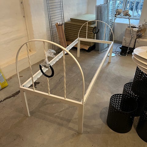 Vintage jern seng 80x180 cm. med dekorative blomster- og geometriske mønstre. Sengen er malet hvid og viser tegn på patina og rust, hvilket indikerer alder og brug. Smuk deko til hjemmet, drivhuset eller butikken.