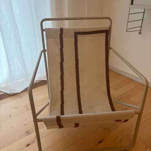 To flotte Ferm Living desert lounge chair - én i voksen størrelse og én i kids. Vi har brugt dem indendørs i stuen men kan også bruges udendørs.