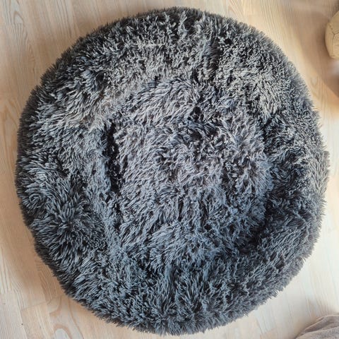 Kæmpestor, stabil og blød pude til både L - XL Og XXL størrelse hund. Puden er 129 cm i diameter. Den er købt i Zooplus hvor man også kan købe andre betræk, hvis man hellere vil have en anden farve. Puden står solidt hvor man sætter den og kan være en behagelig rede til hunde, ideel til gamle og syge hunde, meget blød og hyggelig, fyld af høj kvalitet med viscoelastiske flager, der tilpasser sig og støtter kroppen.