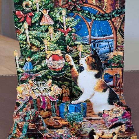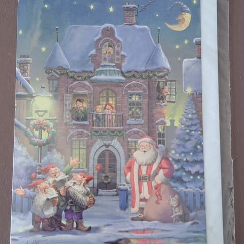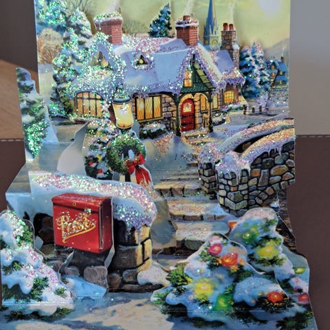 Kortet har glitrende detaljer og viser en traditionel julemandsscene. Kortet er detaljeret og har en pop-up effekt, der giver en tredimensionel oplevelse.