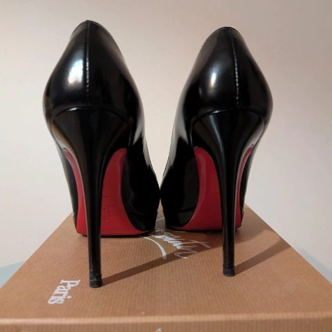 Christian Louboutin højhælet sko i størrelse 40 (passer en dansk str. 39) af sort lakmateriale. Skoene har en klassisk højhælet form med karakteristisk rød sål. Der er brugsspor på sålerne og hælene (se fotos).