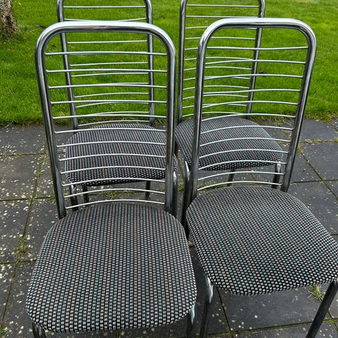 Et sæt på to elegante stole med blankt kromstel og sæder betrukket med ægte, sort-hvidt koskind. Perfekte som spisebordsstole eller som statement-stole i entréen.