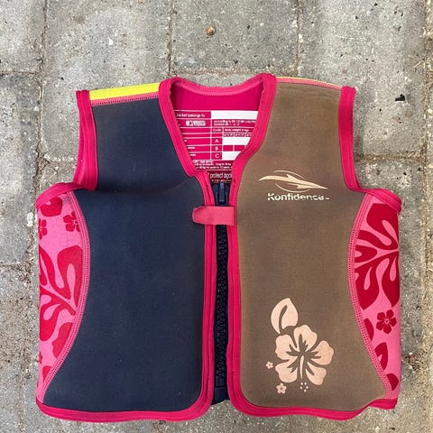 Konfidence svømmevest. Størrelse: “Op til 25 kg”. I god stand. Vesten har nogle misfarvninger. Se billeder. Perfekt til at lære at svømme da opdriftsblokkene kan tages ud efterhånden som barnet bliver mere sikker i at svømme. Brugt til 4-årig, som lærte at svømme uden opdrift på 2 måneder.