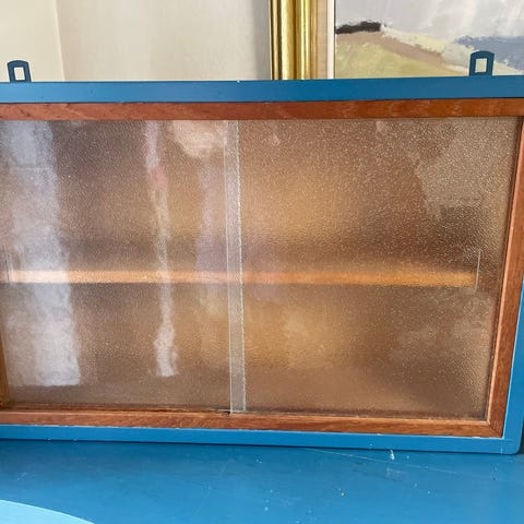- Super fedt skab med mønstrede glas skydelåger samt træhylde og spejlæg: kr 600,-