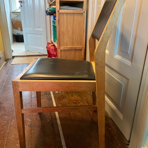 Sælger 8 stk egetræs stole med læder sæde. Samlet pris 2800 kr.
