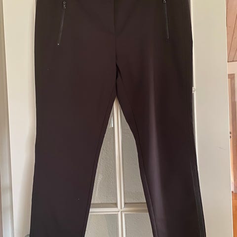 Fransa Bukser i brun farve, størrelse 46 til kvinder. Bukserne har lynlåslommer foran og bagpå samt lynlåsdetaljer ved benenderne. Materialet fremstår som et blødt og elastisk stof, der kan anvendes til dagligt brug.