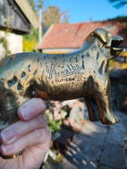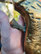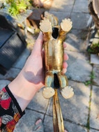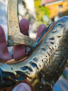 Gammel messing nøddeknækker fra Clinica Gastronomica Arnaldo. En af Italiens bedste restauranter som er den restaurant der har holdt en Michelinstjerne i længst tid siden 1959. Nøddeknækkeren er muligvis fra 1944, da der står 44 på indersiden af håndtaget. Lavet af messing og vejer 2,1 kg.