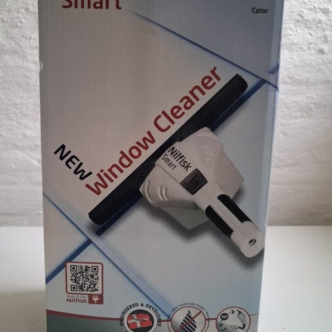 Nilfisk Vinduesvasker i elektrisk model med hvid og sort farve. Enheden er designet til effektiv rengøring af vinduer og glasoverflader. Den har et ergonomisk håndtag og en ledning til strømforsyning. Inkluderer en sprayflaske med påsyet mikrofiberklud til forbehandling af overflader.