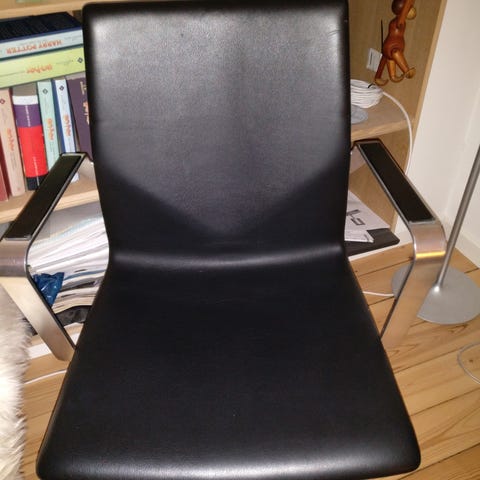 Udført i brun læder med forkromet stel og drejefod med returdrej. Elegant og tidløst design, perfekt til spisebord eller mødelokale.