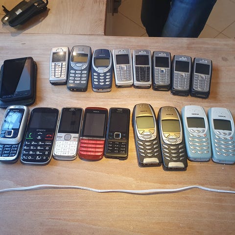 Sæt bestående af forskellige mobiltelefoner af flere mærker og modeller, herunder ældre og nyere enheder, samt diverse opladere og tilbehør. Produkterne varierer i størrelse, farve og funktionalitet. Egnet til samlere eller til reservedele.