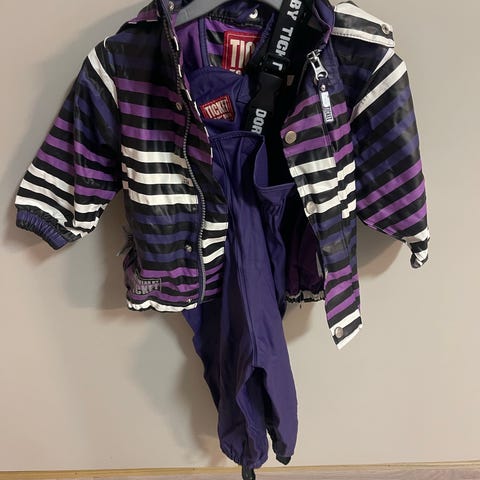 Helly Hansen Ticket to Heaven børnetøj sæt i lilla farve, størrelse 110, designet til piger. Sættet består af jakke og bukser, fremstillet i materiale egnet til børns udendørs brug.