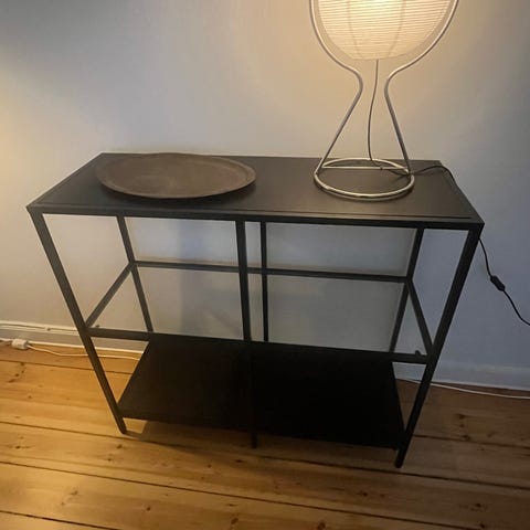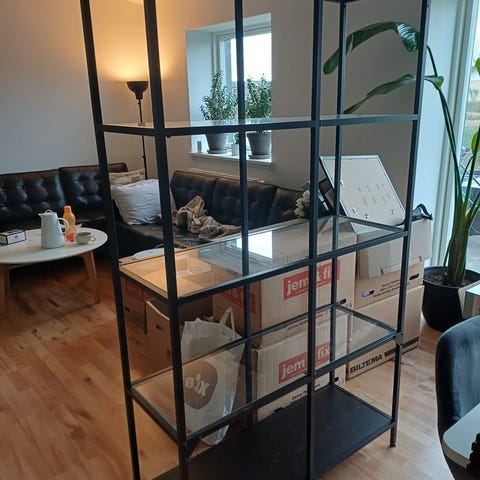 Pæn hvid reol fra IKEA med midterhylde i glas. Velholdt og flot i sin enkelhed.