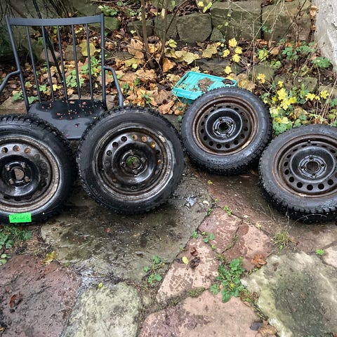 Sælger fire stålfælge. Dæk medfølger men kun to af dem kan stadig bruges. Brugt til Nissan Micra