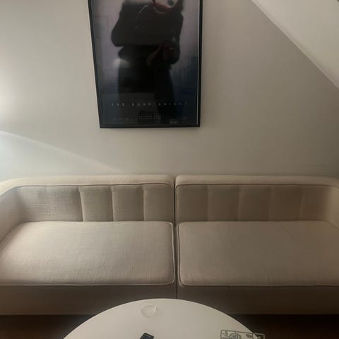På billederne er den ikke samlet men modulerne bare sat op ad hinanden, så når den samles rigtigt, vil ryglænet komme højere op :)