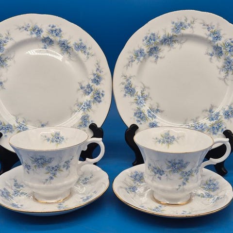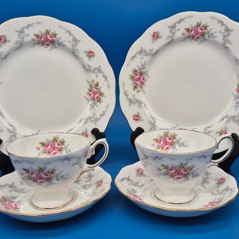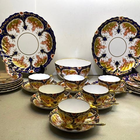 Sælger dette helt nye Halcyon Days te sæt som aldrig er brugt. Det er et meget smukt stel der indeholder følgende: Te kande, to kopper, to underkopper, sukkerskål og mælke kande.