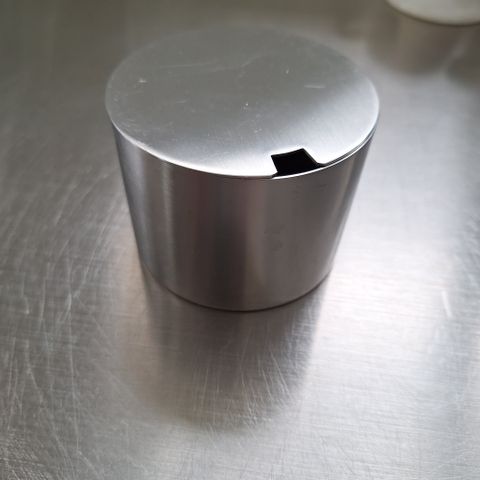 Stelton Stainless sukker skål. Arne Jacobsen design nummer 06/1. højde 5,5 centimeter, diameter 7,5 centimeter. 0,2 L.