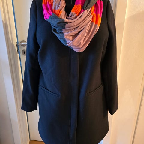 Zizzi Frakke i mørke blå der ligner sort farve til kvinder i størrelse L. Jakken har en hætte og lynlås/knaplukning foran. Uld, nypris 1099.