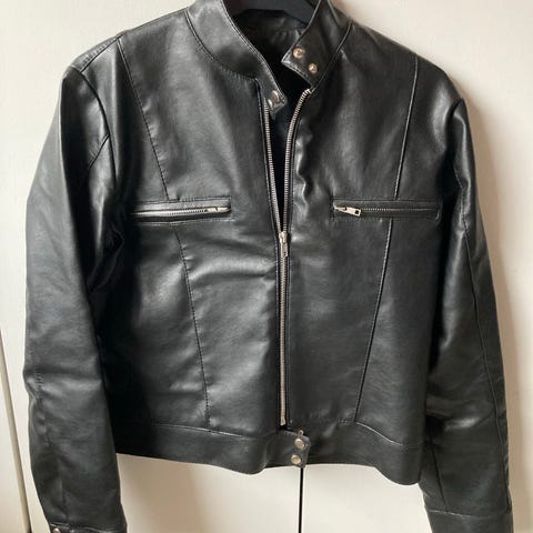 Beige/Sort imiteret skindjakke str. L med stretch på indersiden i ærmerne samt elastik nederst i linning bagpå. Snittet er fitted.