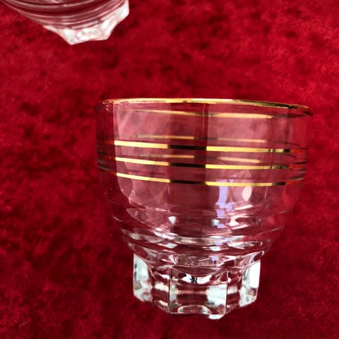 12. stk. Super flotte Retro drueranke glas med guldkant. Rigtig velholdt. Er meget sjældent. Dia.7.cm. højde 11.cm. Sælges for 80kr. stk.