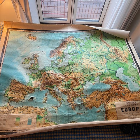 Super fedt kort med højde kontur. Kan rulles sammen. 150 cm gange 160 cm. Gammelt med i meget fin stand.