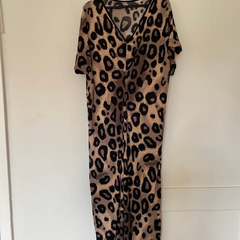 St 38 kort kjole i leopard. Rummelig. Længde fra skulder og ned 90 cm . Liv 49. Ærmelængde 65 cm. Sender ikke.