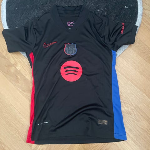 Nike FC Barcelona udebane fodboldtrøje sæson 23/24i størrelse 158-170 unisex design. Fremstillet i Dri-FIT materiale, egnet til fodbold og andre sportsaktiviteter.