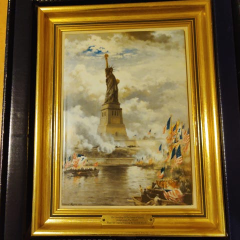 Bing & Grøndahl maleri, der forestiller et skib i havet med flere mindre både omkring. Maleriet er indrammet i en guldramme. Motivets farver inkluderer blå, grå og brune nuancer. Maleriet er velegnet til vægophæng og dekoration.