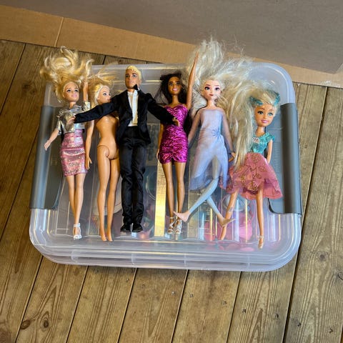 Barbie dukker sæt bestående af tre dukker i forskellige størrelser. To større dukker med langt blondt hår, hvoraf den ene er iført blå bukser og lyserød top, og den anden er iført en lyserød kjole. Den tredje er en mindre dukke med lyst hår og sort tøj. Dukkerne er lavet af plast og tekstilmaterialer.