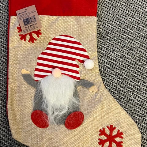 Ny ikke brugt jule strømpe ca 40 cm lang. Har 2 andre med andre nisse i andre annoncer - alle 3 kan sælges samlet for 50kr. 1 stk 20kr / nypris 40kr stk.