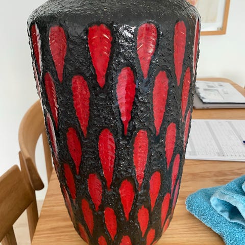 Scheurich vase i keramik med blå og grønne farver. Vasen har en højde på cirka 20 cm og er mærket med 'Made in Germany' samt modelnummer 563-20. Velegnet til dekorative formål.