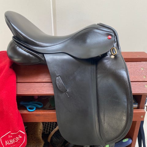 Albion SL, W 17" dressur, sort, 4 år (som ny) brugt max 5 gange pga. skadet hest. Har altid hængt indenfor. Et lille mærke på bagsvitsel (se foto) prisside kr. 8.800 eller realistisk bud.