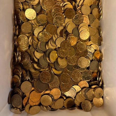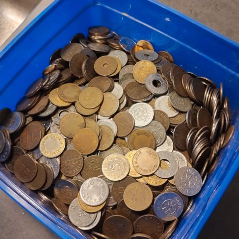 Til "enarmedetyveknægte" (spillemaskiner) sælges ca. 220 stk gamle 25 øre og ca. 90 spillemæker af størrelse 25 øre.