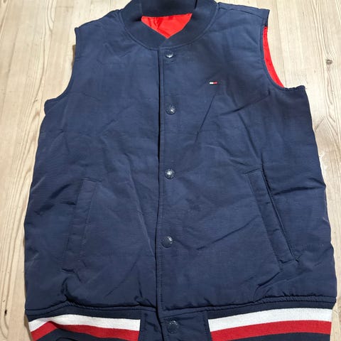 Tommy Hilfiger unisex børnevest i størrelse 164. Vesten er blå og har en hætte. Den har lynlås foran og lommer på hver side. Materialet er polstret for ekstra varme.