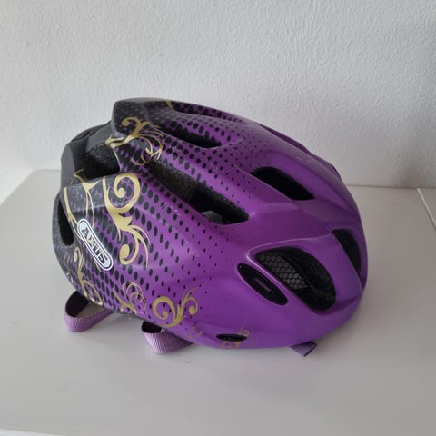 Den har rødt baglys og reflekser på hjelmen, så barnet er ekstra synlig i trafikken
