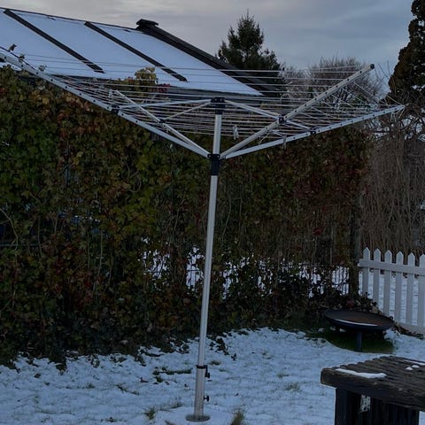Skal afhentes i Frederikssund. Rotationsvaskestativ med beslag til fastgørelse. Vaskestativet er lavet af metal og plast og er designet til udendørs brug. Det kan foldes sammen for nem opbevaring og har flere snore til ophængning af tøj. Fod medfølger.