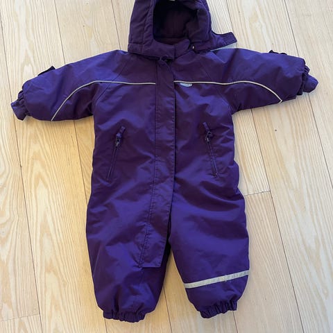 Super fin lilla flyverdragt i str 92 sælges. Brugt, men stadig i super stand. Sidste billede viser en lille ridse, men der er ikke hul. Intet slidt eller huller mellem ben eller andre steder. Meget praktisk med små “vanter” til hænderne. Stropper til under fødderne er der også.