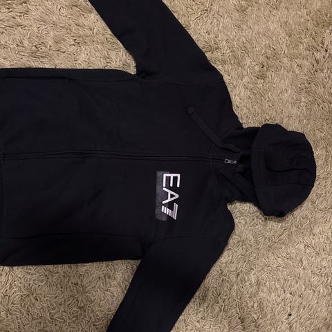 Armani EA7 hoodie i sort farve, størrelse M til mænd. Fremstillet i materiale egnet til daglig brug. Har lynlås foran og hætte med snøre. Logo på brystet.