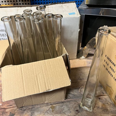 14 stk. høje vaser, 32 cm. Sælges samlet. Der kan være 1-2 stilke i hver vase og de er flotte til bordpynt. Jeg sender gerne + porto, men de kan også afhentes i Benløse.