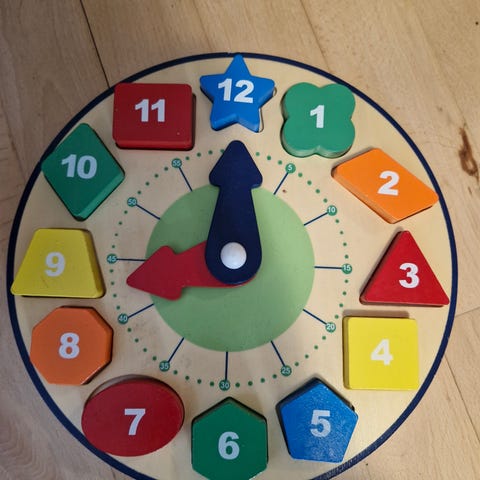 Læringslegetøj i træ med farverige urskive og bevægelige visere. Designet til at hjælpe børn med at lære at aflæse tiden og forstå tal og farver. Velegnet til pædagogisk brug og børns tidlige læring.