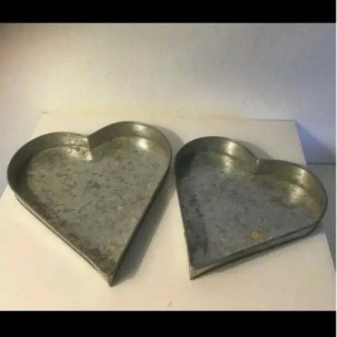 2 hjerter i metal som vase eller fad til dekorationer og blomster