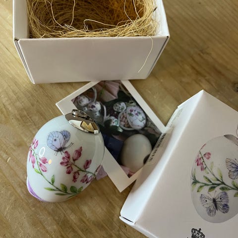 Royal æg 2 stk i æske Med rede og blåt bånd med 3 stempler i bunden