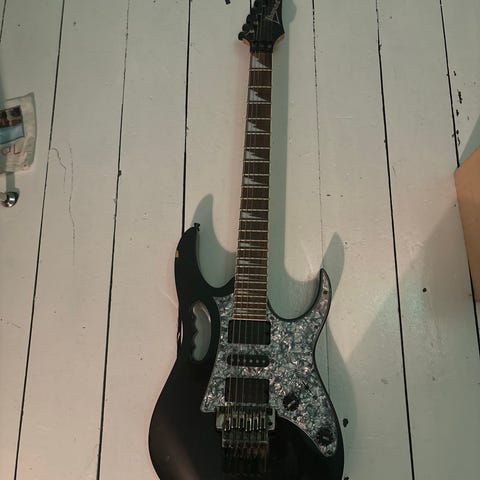 Ibanez EX1500 elektrisk guitar med sort finish. Guitaren har en træhals med indbyggede stemmeskruer i guld. Vibratoarm mangler